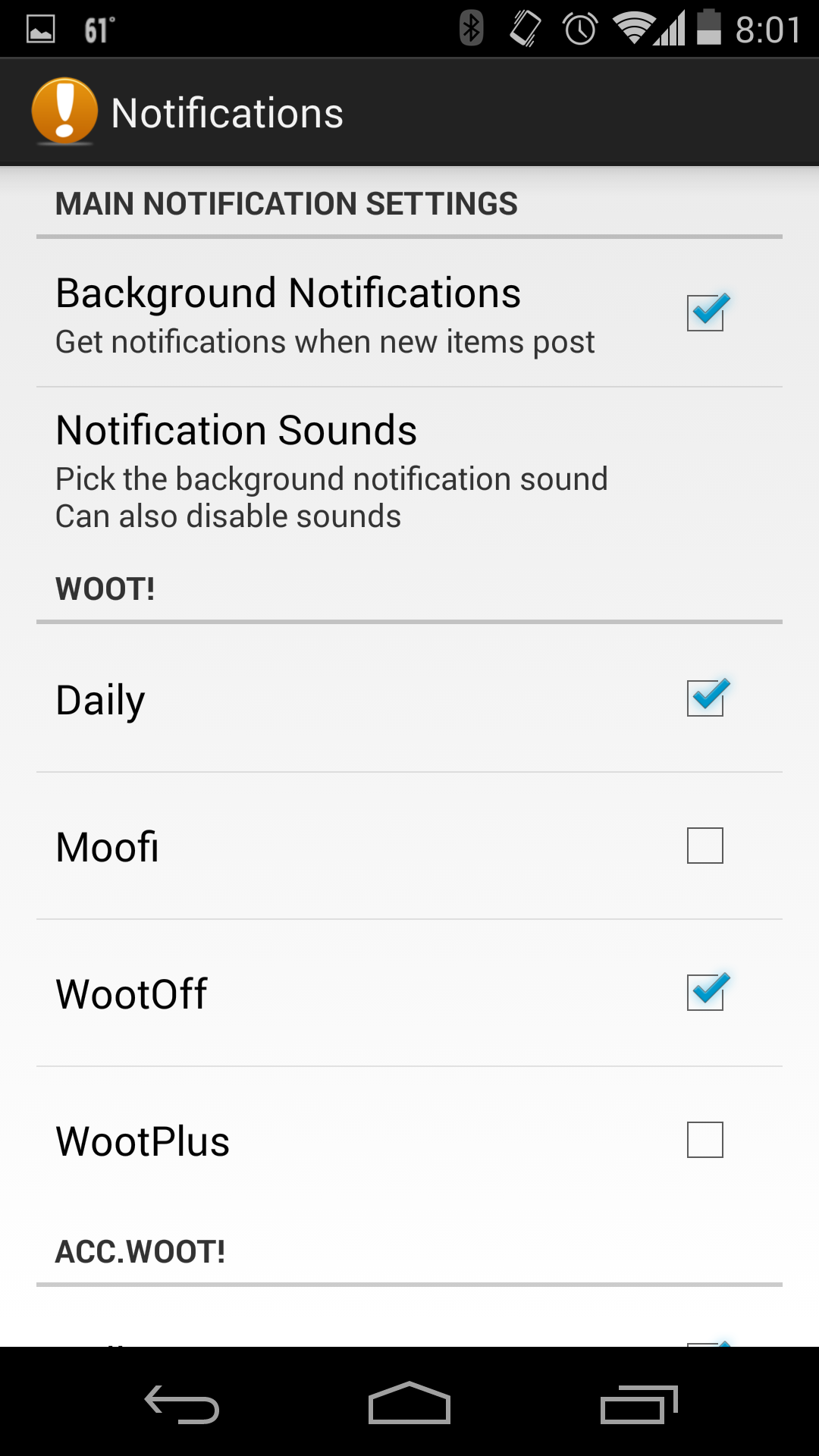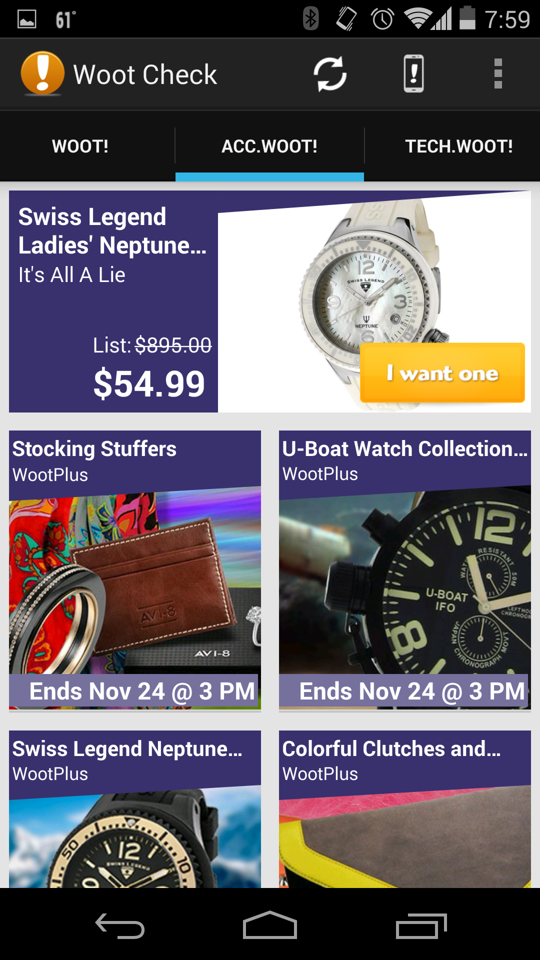 Woot Check allows you to easily watch all of the daily deals on Woot with a clean, easy to use interface. Sites include Woot, Wine, Shirt, Sellout, Kids, Home, and Moofi.